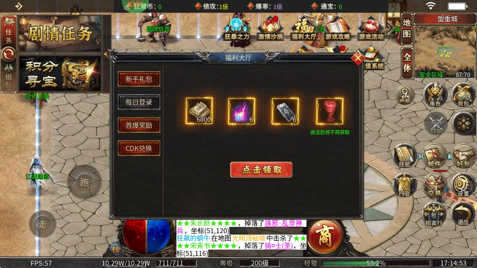 1、3元购买畅玩礼包,领取神技十步一杀+切割+货币!