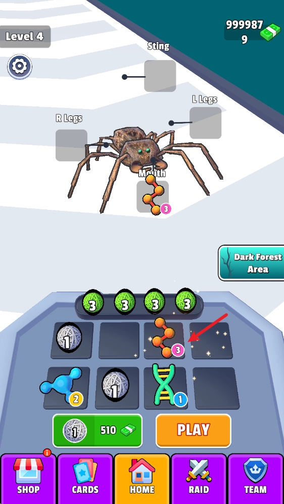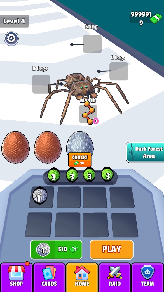 3、收集闪耀的DNA球体,解锁更多神秘的蜘蛛形态,从潜行的暗影爬行者到光芒四射的水晶爬行者,每一种的属性都不相同。