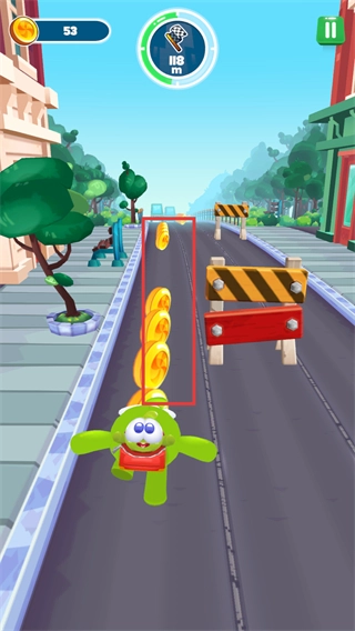 2、收集红框标注道路中的【金币】,需操控角色收集金币并躲避黄黑警示栏类路障。