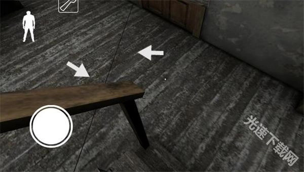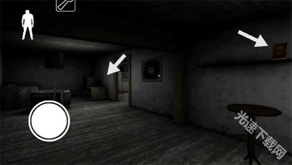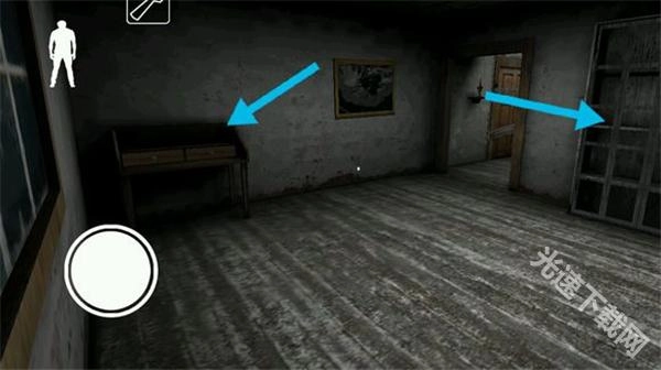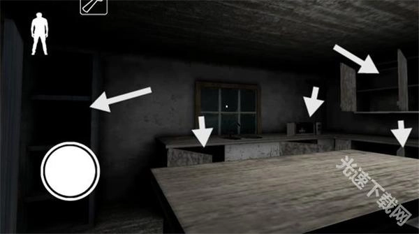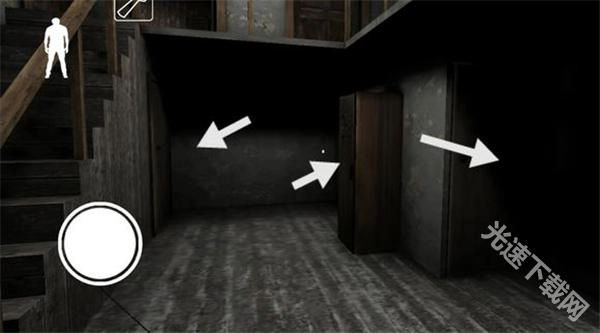 下楼梯后,左边地板上有一根黑线,踩上去铃铛会响,得留意。楼梯旁的柜子能藏身,柜子对面有扇门,里面或许会刷新物品。柜子旁边还有一扇门通往地下室(因为画面比较暗)