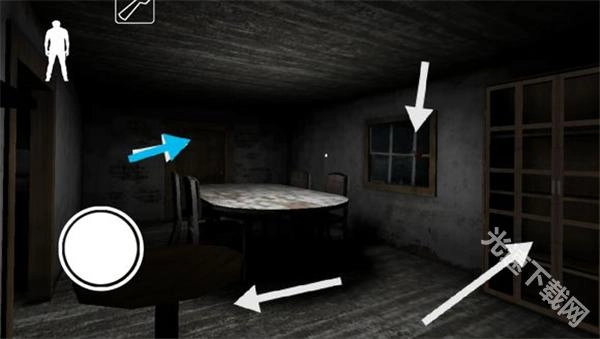 厨房的后方是餐厅区域。这里的椅子很稳固,不会轻易被碰倒,但小桌子和灯具则容易被撞倒。带有血手印的窗户能够翻出去到达后院,而那个被蓝色箭头标记的门通常是锁着的,只有Granny才能打开它。