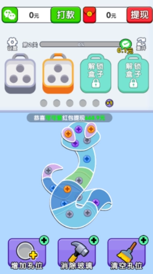 1、在游戏过程里,点击螺丝就能把它收纳进对应颜色的螺丝盒里,只要凑齐三种相同颜色的螺丝盒就能成功消除。