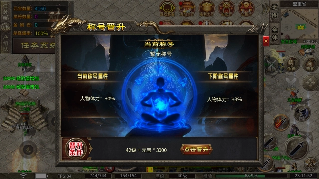 4、称号晋升:到达42级就能够消耗元宝晋升,每一级都会提升人物的体力。
