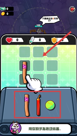 1、进入游戏后根据新手引导,用手指将下方武器栏中的装备拖拽至上方战斗格子中,两件相同武器相邻即可自动合成升级。
