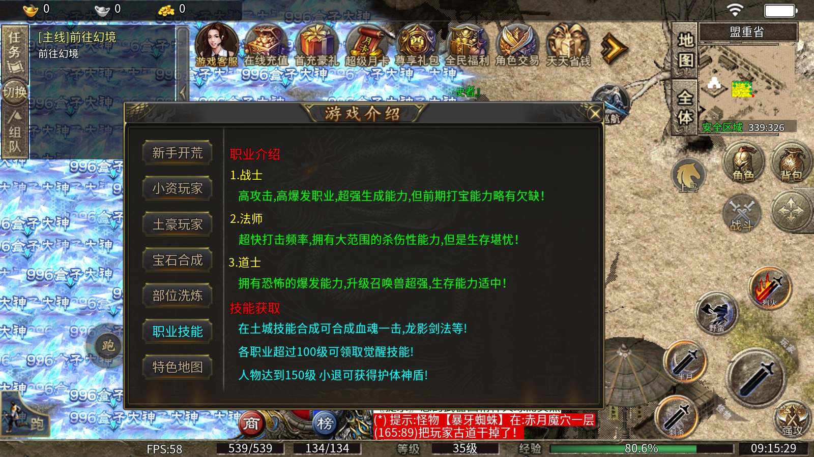 1、本服有着特殊的九重技能玩法,可以通过书页抽奖获得技能,不同职业的技能也会有所不同。