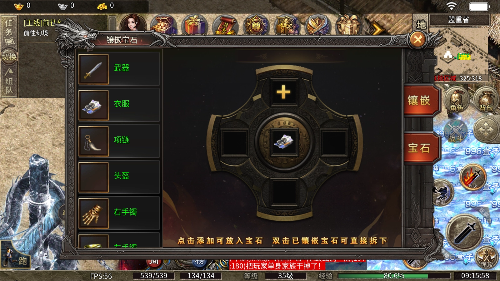 2、武器,项链,戒指可镶嵌红宝石增加攻击;衣服,手镯可镶嵌紫宝石增加血量;头盔,腰带,鞋可镶嵌绿宝石增加防御。