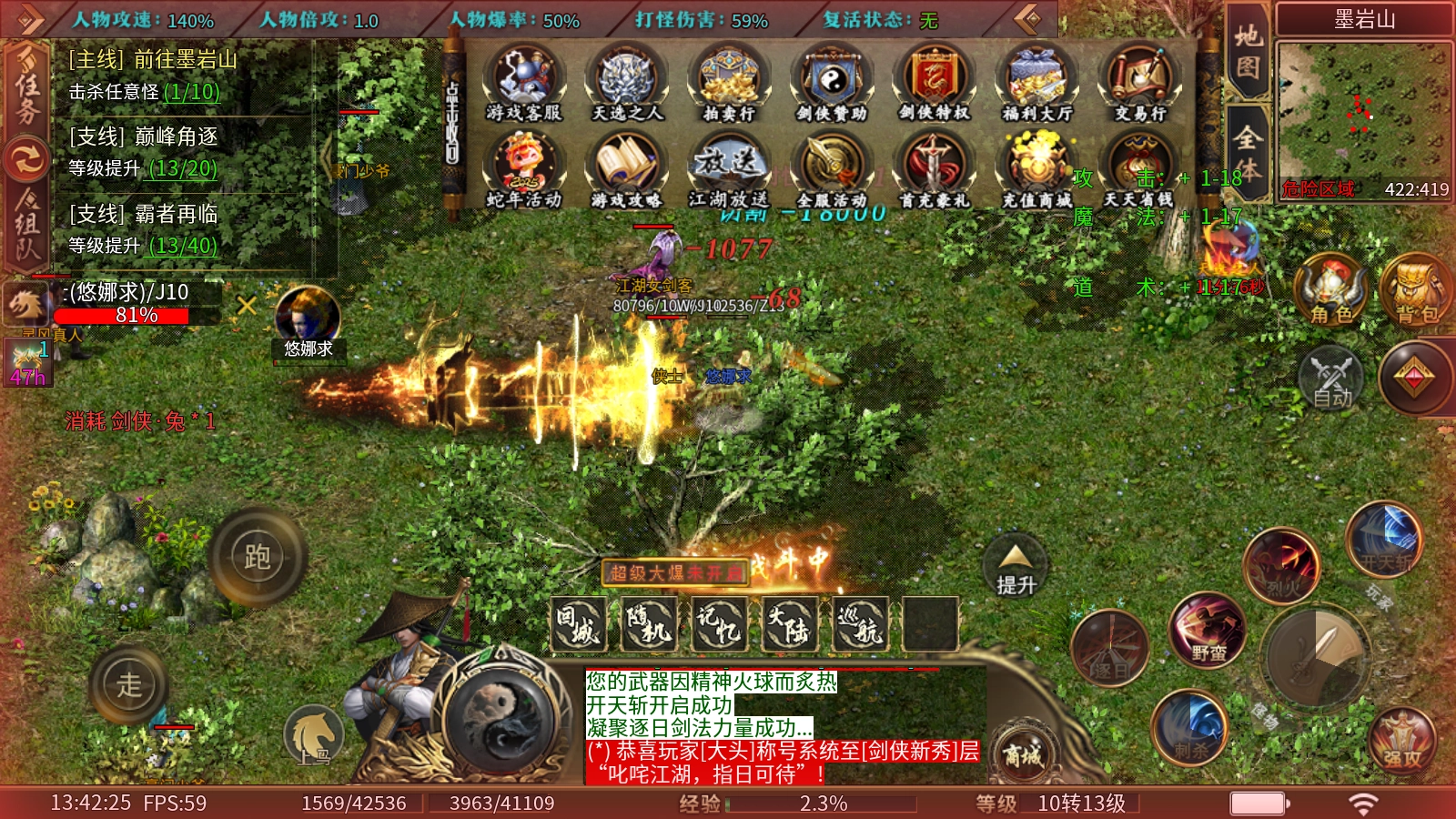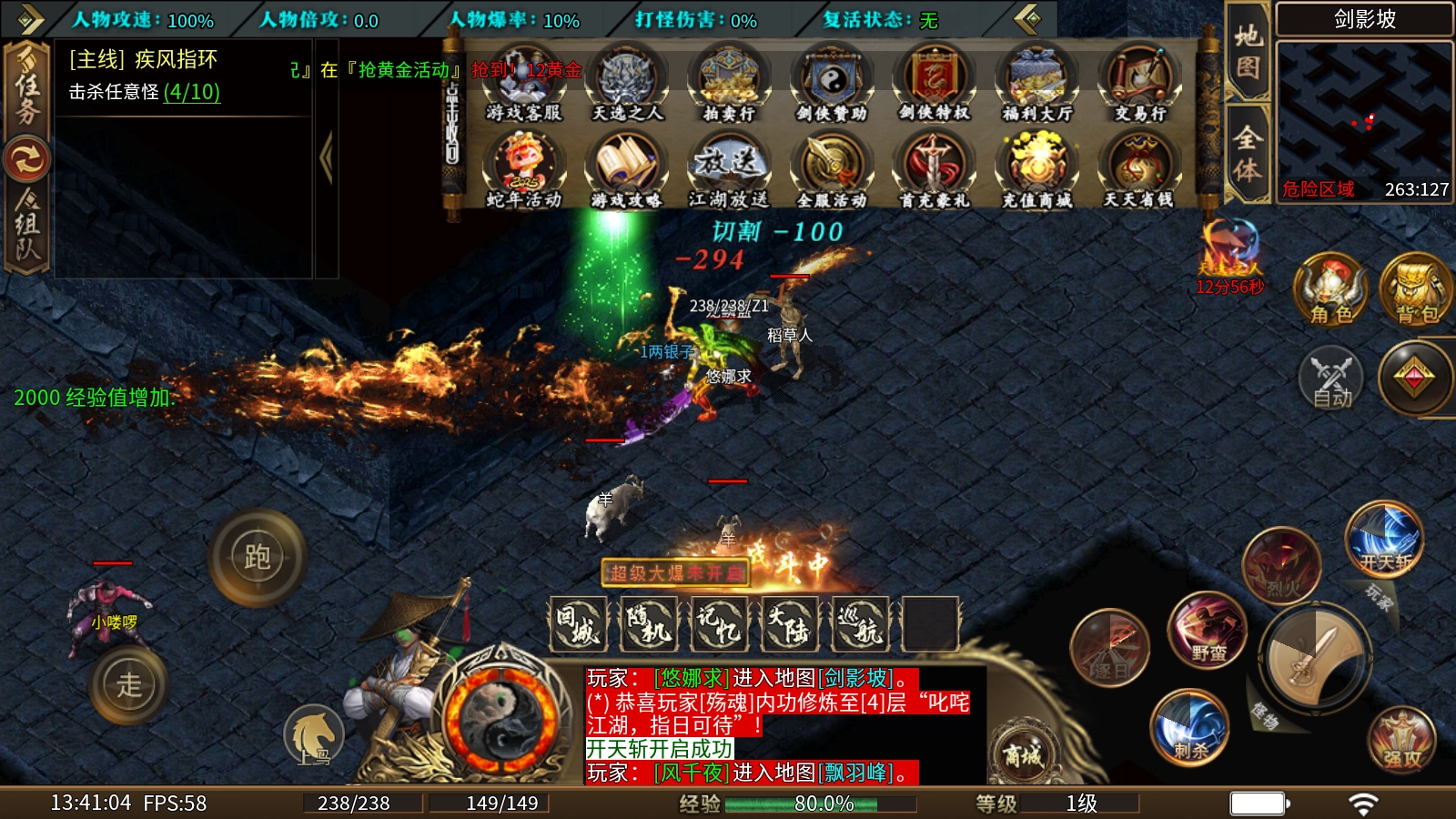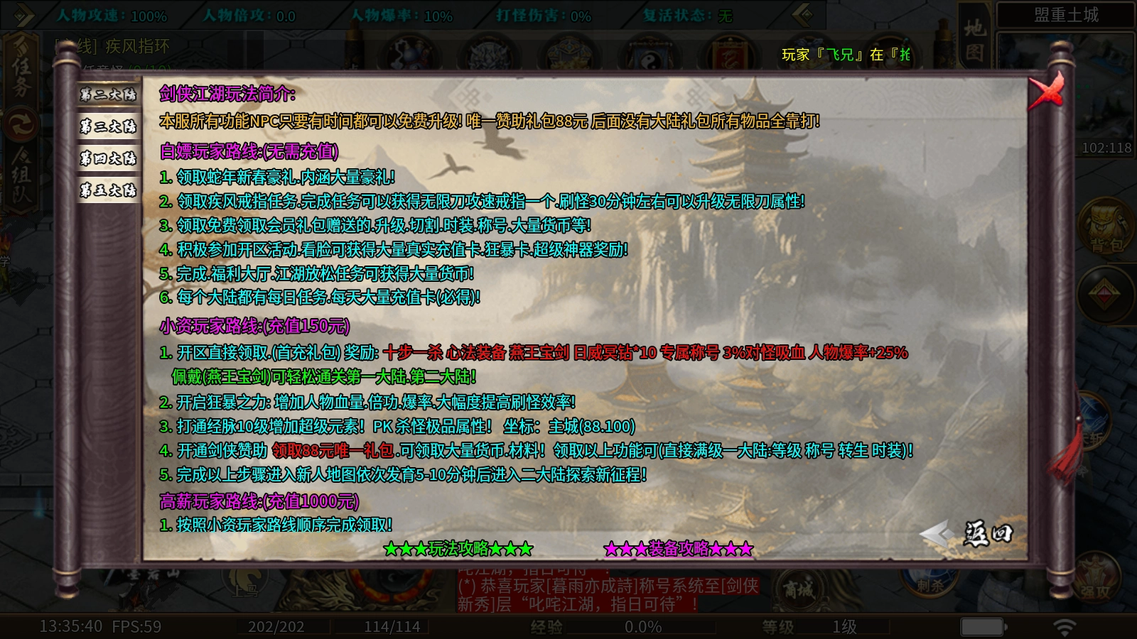 1、开区直接领取首充礼包,奖励十步一杀、心法装备、燕王宝剑、3%对怪吸血、专属称号、10个日威冥钻、人物爆率+25%。佩戴燕王宝剑可轻松通关第一大陆和第二大陆!