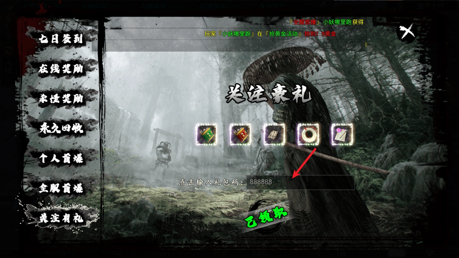 兑换方式:点击上方的福利大厅,选择关注有礼,输入礼包码即可。
