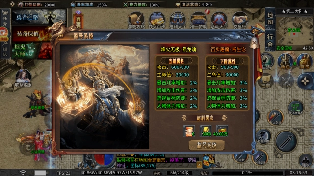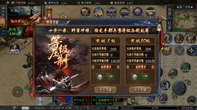 1、等级突破:自二大陆起,等级需要消耗元宝和等级石进行突破,高等级还会有一定压制作用。