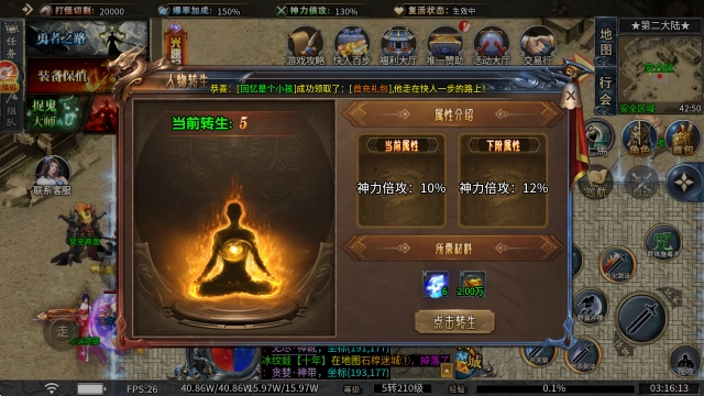 2、转生使者:消耗转生石和元宝进行提升,增加角色的神力倍攻属性。