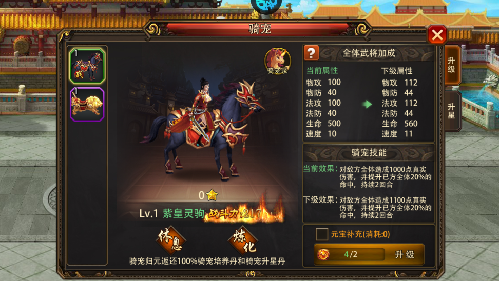 通过提升骑宠等级和星级,可为全体武将带来更多属性加成
