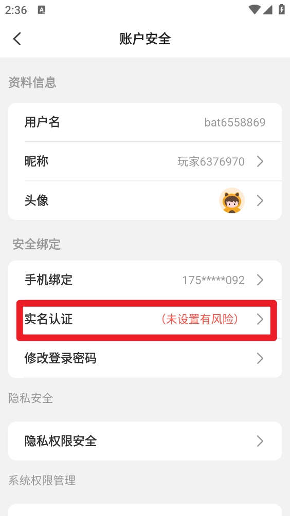 4、在账户安全页面打开"实名认证"按钮。