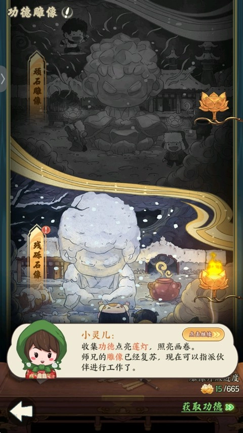 3、完成任务后会获取功德,积攒到一定数量后可获取赐福,来解锁新功能;
