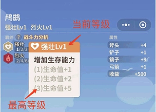 当前等级:角色所有羁绊的总和,比如你装备一只强壮Lv1+强壮Lv2的宠物,就会获得强壮Lv3的效果,生命值+5。