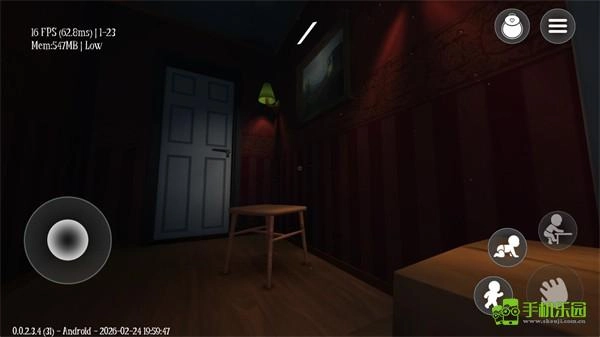 3、正式开始后,左侧用于控制角色移动,滑动屏幕能够转动视角,右侧的按钮依次对应奔跑、爬行、攀爬与抓取功能。