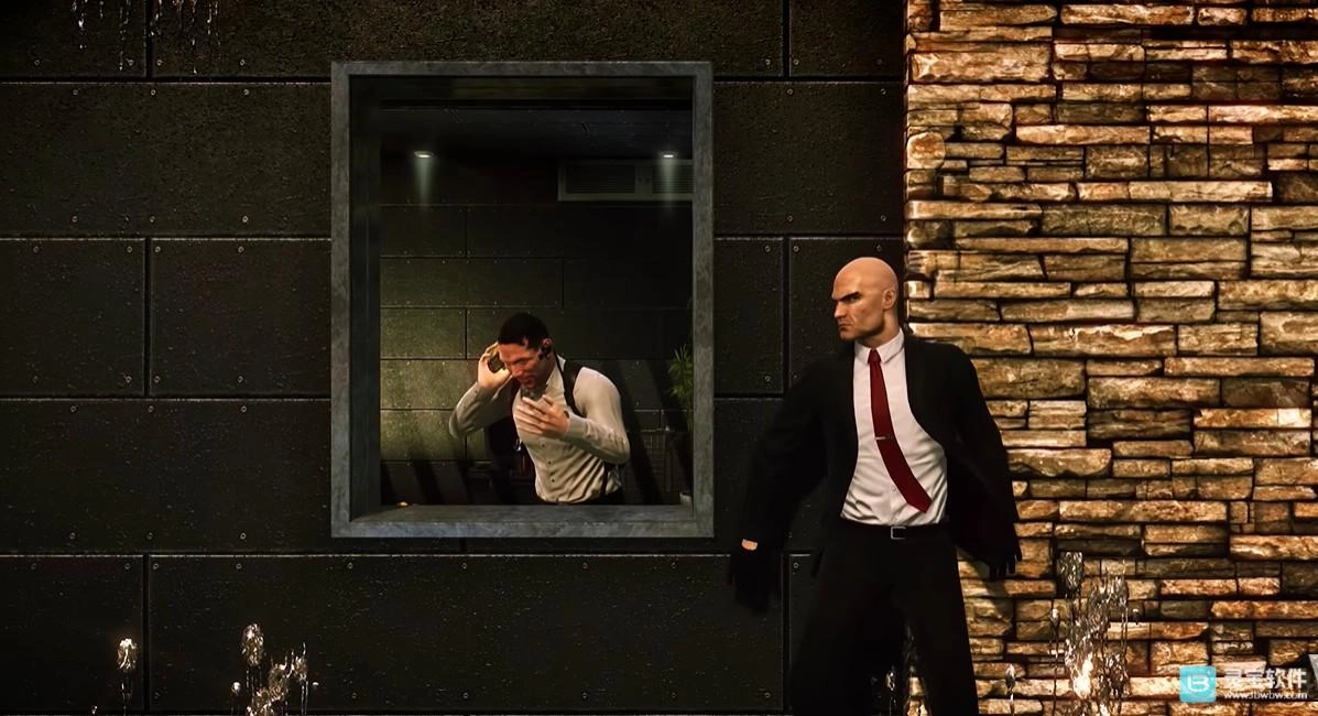 这款游戏新增了掩体系统。在树干后利用消音手枪解决掉第二名守卫,然后将尸体藏进垃圾桶。接着继续前行,在网球场会遇到一名正在打电话的守卫,你可以选择用钢丝将其绞杀,也可以悄悄绕开。之后右转走下石阶,解决第四名守卫并把尸体拖到角落。转角处设有存档点,记得手动保存进度。