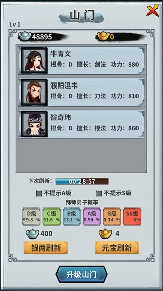 在招募弟子的场所,山门的等级越高,招募到高资质弟子的概率就越大。这里有剑法、刀法、棍法、枪法、拳掌指法这5种不同武学方向的弟子,会依据弟子的资质来传授相应的武学,只有高资质的弟子才有资格学习高等级的武学。