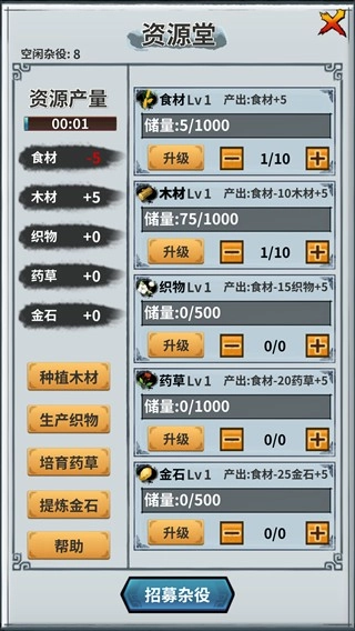 这是一个招募杂役进行资源生产的场所。玩家可以通过在江湖地图中探索、击败怪物并占领各类资源点和作坊,以此提升资源生产的上限。还能调配杂役去生产所需的资源,这些资源主要用于为炼丹房和铸造坊供应各类基础材料。