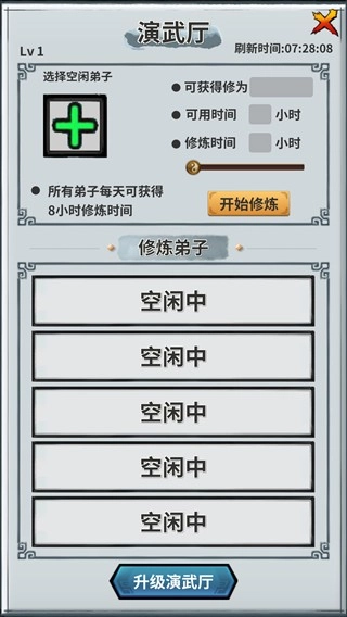 用来给与弟子修炼武学的地方,可以获取大量的阅历来提升武功与内功的等级,每天每个弟子可修炼最多8小时。