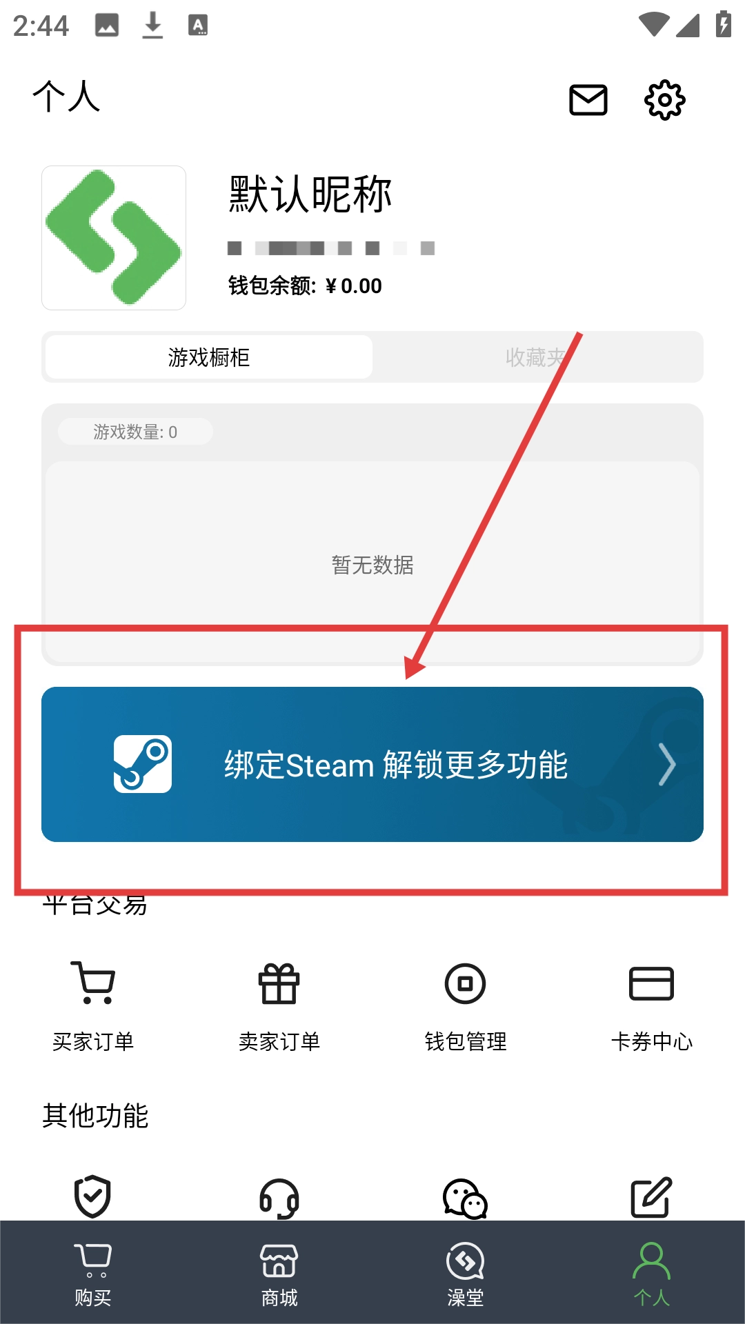 2、进入个人中心页面后,点击【绑定Steam解锁更多功能】,可进入Steam登录页面哦。