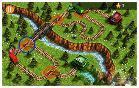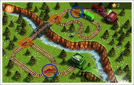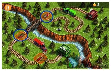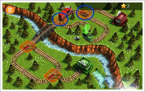 3、等到右侧火车通过转弯处,快速点击蓝圈处,使左侧火车通过。注意,这个时间比较短,需要快速做出更改。