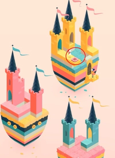 结构变换:第三场景先将建筑搭建成图示形态,再经过两次移动即可进入门内。到达新场景后,旋转轴承使建筑呈图示样式,向上移动建筑让角色站上,随后抬升建筑即可到达门处。
