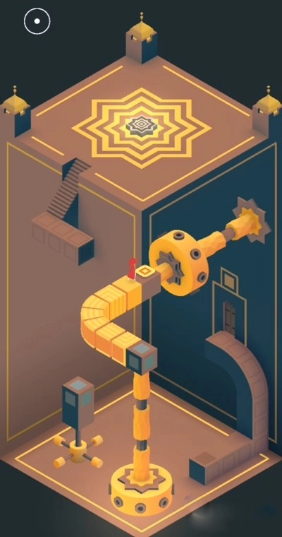 螺旋上升:第三场景向上旋转建筑,搭建通路让角色接触发光小人,随后返回类似第二场景的布局。通过四次精准旋转建筑,引导角色进入最高层的门。