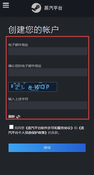 2、接着进行账号创建操作,输入邮件地址并确认该邮箱地址,输入验证码,同意相关服务协议后,点击“继续”按钮。