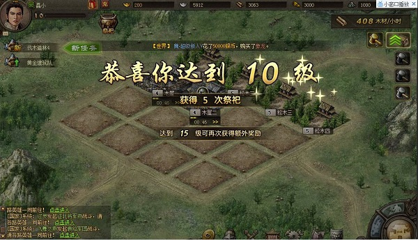 随着任务NPC的一步步的示,我们很快达到时10级,并有了自己的木场,同时也获得了5次祭祀哦!同时祭祀系统也将开启!