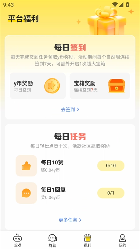 每日签到、每日任务和试玩等领取丰厚y币奖励。