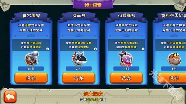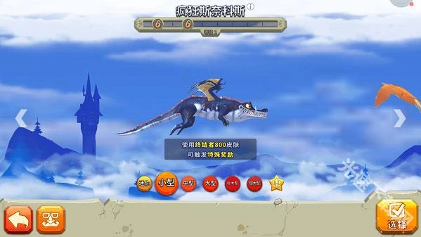 2、进入领土探索界面后,就能按照任务要求选择龙、皮肤和宠物,可参与的龙尺寸包括:“迷你”“小”“中”“大”“巨大”“超大”