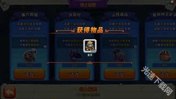 4、探索结束后,左下角会出现领奖提示,点击该提示进入即可领取奖励。奖励包含:金币500至10000,宝石2至25,以及福利龙蛋和高级龙蛋。