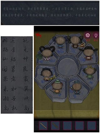 10、开启后,在桌上拿到瓷器,根据门上的画在墙上的砖块后输入密码,打开获得提示。