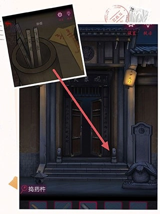 5、在桌上拿到秤砣五,桌角下左边拿到引火棒,桌角下右边拿到未点燃的灯笼,柜子锁密码是:【储記信堵】,打开获得摆件塔。