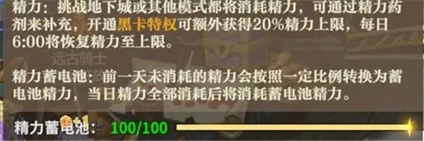 挑战地下城或其他模式都将消耗精力,每日6:00将恢复精力至上限。前一天未消耗的精力会按照一定比例转换为蓄电池精力,当日精力全部消耗后将消耗蓄电池精力。