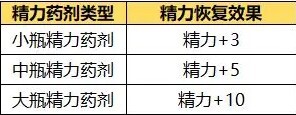 药剂分类精力药剂分为小瓶精力药剂、中瓶精力药剂和大瓶精力药剂三种。每种精力药剂可恢复精力数值不同,每日可使用的次数有限,请合理分配使用精力药剂哦~