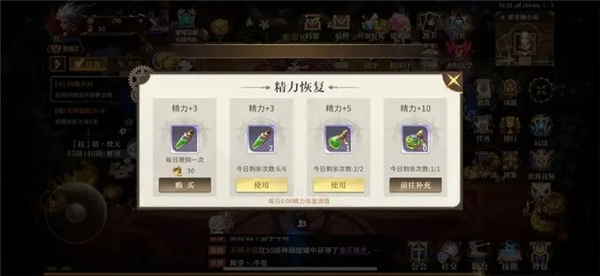 注:当角色精力为0时,在城镇界面,点击左上角精力旁的“+”号,即可使用30绑定点券恢复3点精力。