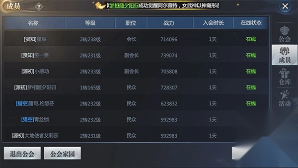 我们在成员界面查看公会成员时,最上方有一排筛选功能,能帮助大家了解公会内的职业分布和等级情况。