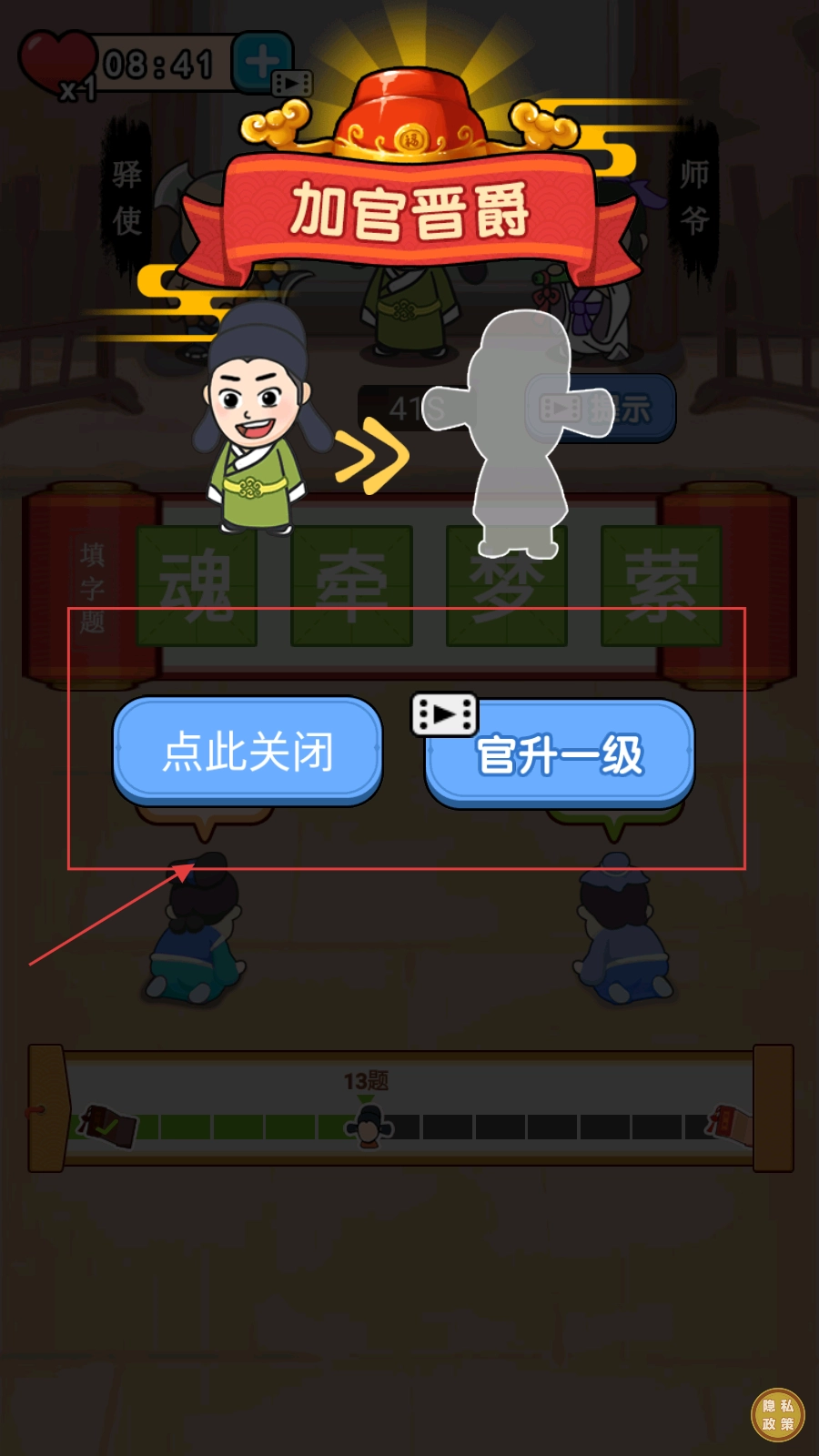 4、通关后出现【加官晋爵】,选【点此关闭】或【官升一级】。