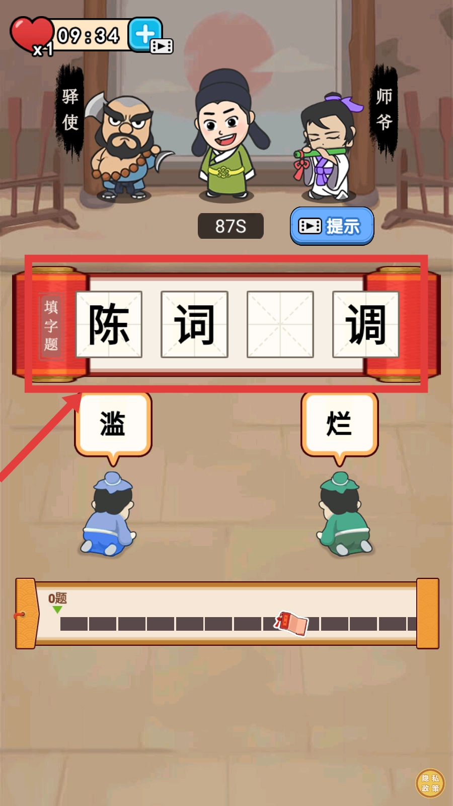 2、碰到填字题目时,把正确的字拖到空格里面,完成像【陈词滥调】这类的词语。