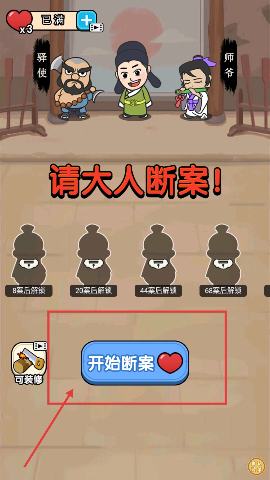 1、点击【开始断案】,消耗红心进入案件,准备答题断案。