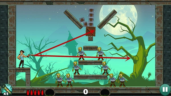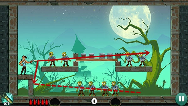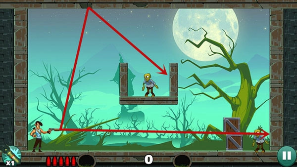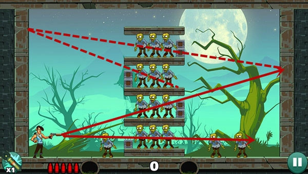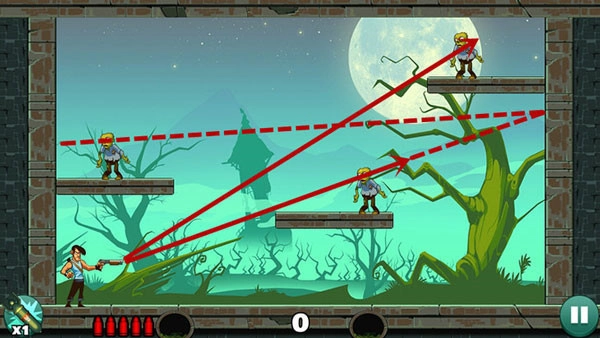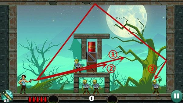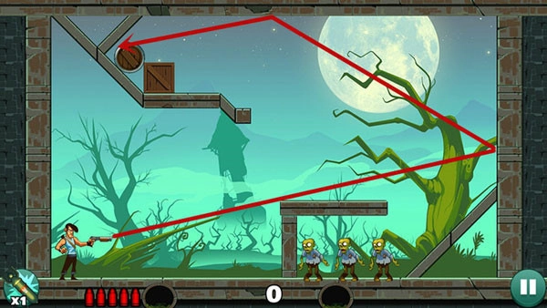操作起来比较轻松,底部的僵尸用直线射击就能解决,上方的敌人则可以借助墙面反射来命中,要是对角度不太熟悉,多尝试几次就能掌握了。