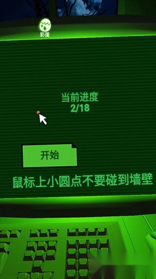 4、画面呈现的是坐在电脑前进行游戏,把鼠标光标移动到【开始】按钮上,就能开启下一关。需要注意的是,鼠标上的小圆点不能碰到墙壁,否则会触发恐怖机制。