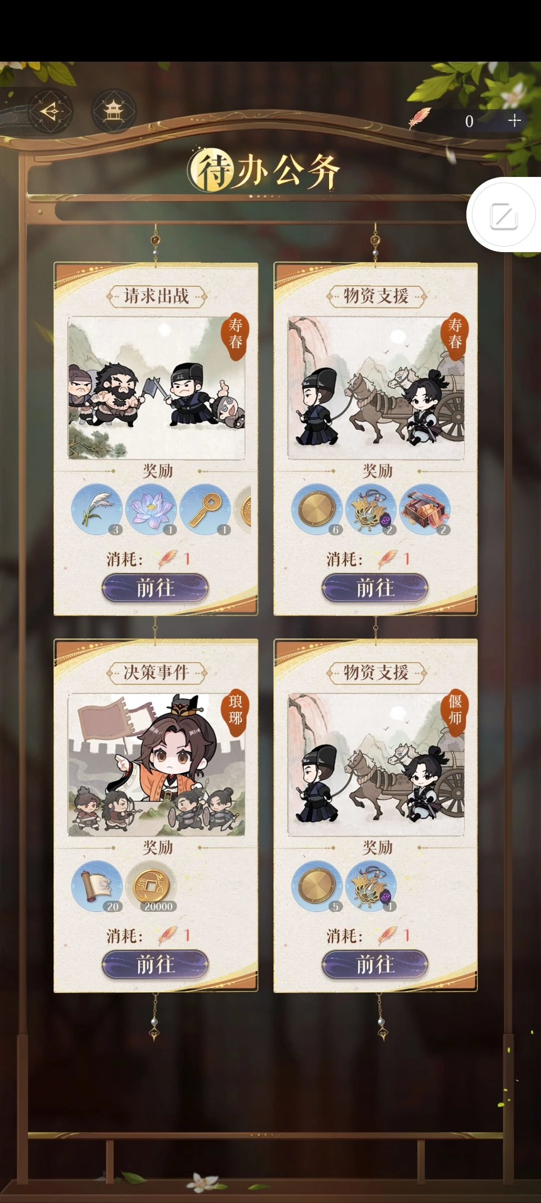 :代办公务时,优先选择“出战”选项以获取更多资源,其次考虑“物资支援”(可得紫色材料×8及材料箱×4);