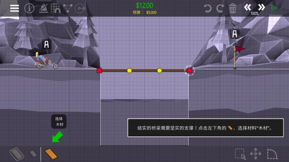 2、从工具栏选择材料,在两岸之间搭建支点,并用木板或钢梁连接形成通路;