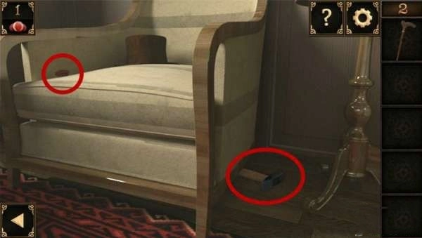 2、收集左边沙发上面的红色宝石,捡起地上的锤子。