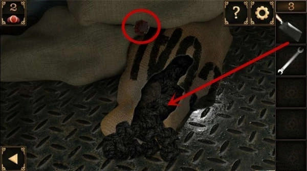3、接着点击右侧地面上的麻袋,用小刀把麻袋割破,看到里面装的是煤炭,再用铲子铲取一些煤炭,将它们放入阀门内的火炉里。