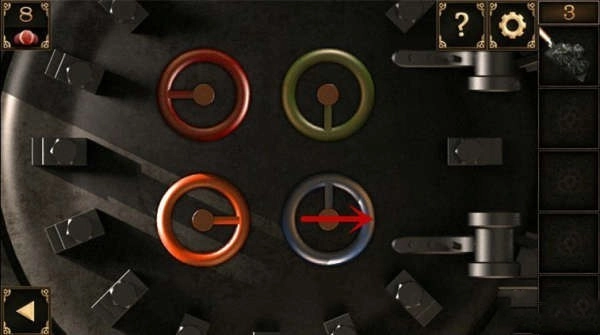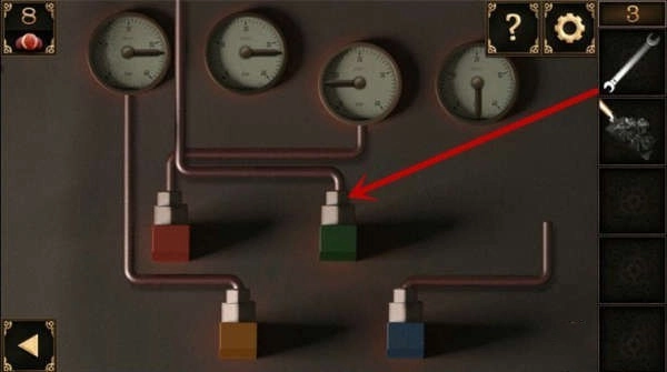 7、接着点击阀门,其上方有四个不同颜色的把手,按照之前获取的提示来调整把手位置(红色把手调至左侧,绿色把手调至下方,橙色把手调至右侧,蓝色把手调至右侧)。
