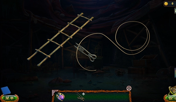 6、从箱子里取出球面石和剪刀。随后组装并打开刚才的梯子,把上面散落的木材安装到梯子上,最后解开绳子,用剪刀将其剪断。