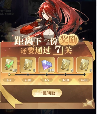 每通过五关可以领取钻石,通过十关可以获取10张黄卡进行武姬招募。
